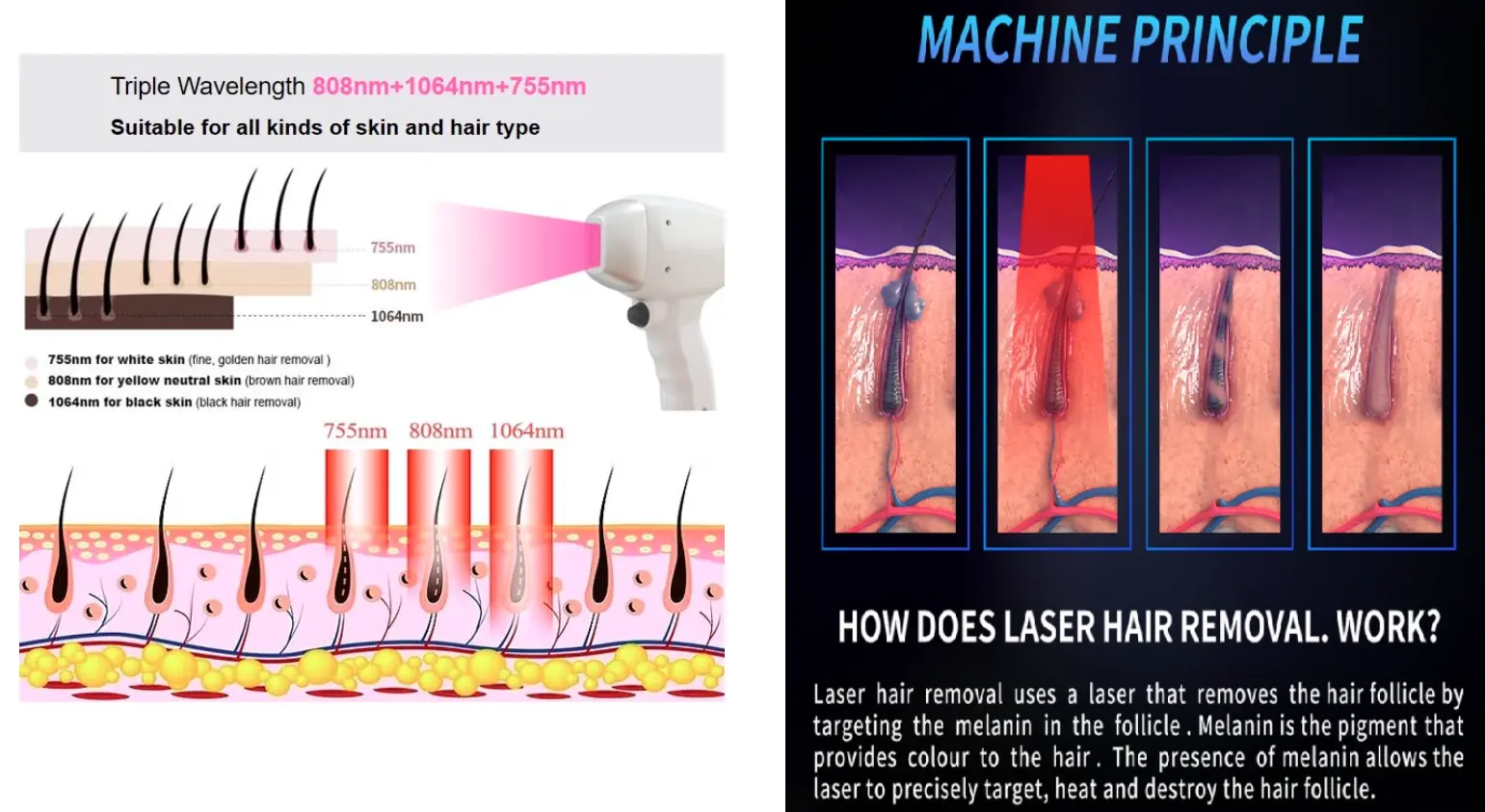 डायोड लेजर हेयर रिमूवल तकनीक प्रकाश और गर्मी के चयनात्मक गतिशीलता पर आधारित है। लेजर बालों के रोम की जड़ तक पहुंचने के लिए त्वचा की सतह से गुजरता है, प्रकाश को अवशोषित किया जा सकता है और गर्मी क्षतिग्रस्त बाल कूप टिसस में परिवर्तित किया जा सकता है, ताकि बाल पैपिला चोट के बिना चोट के ऊतक के बिना क्षतिग्रस्त हो।