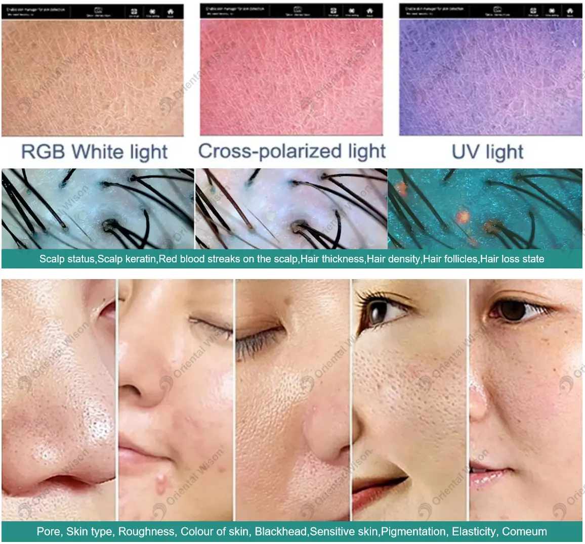 विश्लेषक एलईडी इलेक्ट्रॉनिक स्क्रीन पर सभी त्वचा और बालों की समस्याओं को प्रस्तुत करने के लिए "स्पेक्ट्रल इमेजिंग तकनीक +" का उपयोग करता है। इसमें AI मान्यता तकनीक भी है। डीप लर्निंग टेक्नोलॉजी, 3 डी सिमुलेशन और अन्य प्रौद्योगिकियों के माध्यम से, यह उचित और अच्छी तरह से स्थापित तरीके से समस्याओं का विश्लेषण और मूल्यांकन कर सकता है और हमारी त्वचा और बालों के स्वास्थ्य संकेतकों का पता लगा सकता है। इसके अलावा, स्किन डिटेक्टर मानव त्वचा की नमी और लोच संकेतकों का भी पता लगा सकता है, और परीक्षण के परिणामों के आधार पर एक उचित त्वचा देखभाल योजना तैयार कर सकता है, और समस्या के अनुसार उपयुक्त सौंदर्य प्रसाधन और त्वचा देखभाल उत्पादों का चयन कर सकता है।